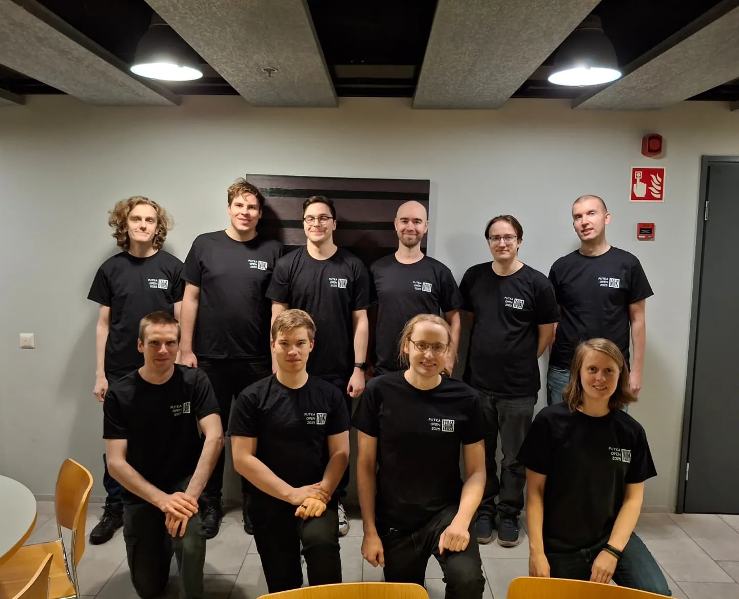 Kuva Putka Open 2025 -finaalista. Takarivissä: ollpu, Laakeri, Yytsi, Sisuaski, Kuha, pllk (Antti Laaksonen). Eturivissä: Metabolix, Lieska, sharph2 ja kisavirkailija.